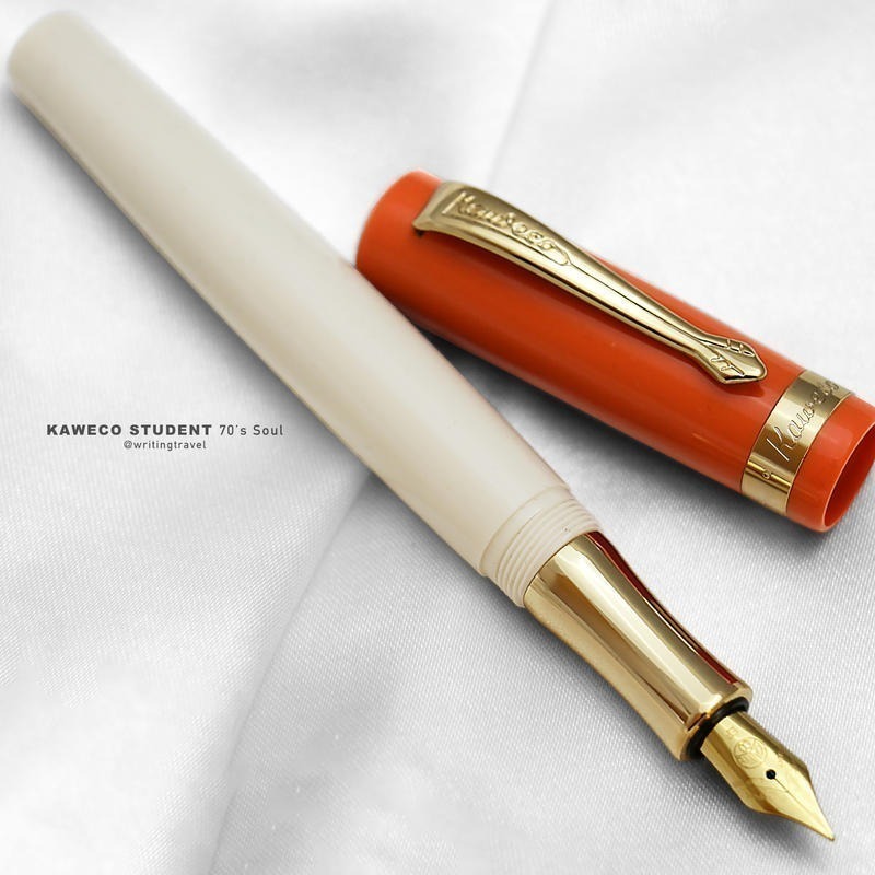「學生(STUDENT)」系列屬於Kaweco的入門鋼筆系列之一,具有令人深刻的古典風格,筆身採用高品質壓克力以射出成型製作;「70年代靈魂」,展現懷舊氣息,筆身爲奶油色,搭配橘色筆蓋,筆蓋的鍍金筆夾和飾環,以及金色握位,讓整支筆充滿濃濃的復古風,且筆尖採用德國Bock不銹鋼鍍金筆尖,整體感佳,其筆尖筆幅有EF尖(極細)、F尖(細字)、M尖(中字)、B尖(太字)、BB尖(極太字)。