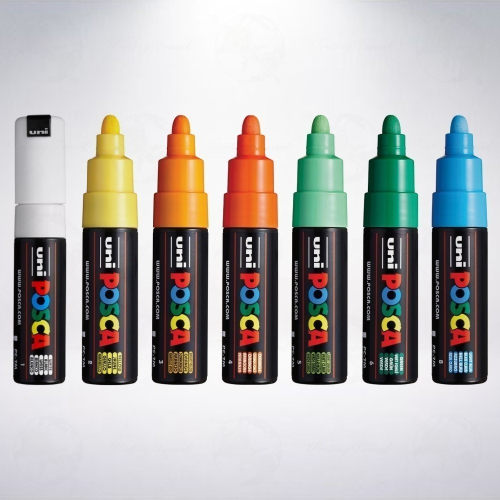 日本三菱出品的水性麥克筆,書寫線寬約為4.5-5.5mm(PC-7M),筆頭為子彈頭設計,可用於繪製中大型海報等用途。賣場現有PC-1MR、PC-1M、PC-3M、PC-5M、PC-7M、PC-8K、PC-17K等尺寸,有需要的朋友可隨自己的使用需要選購。