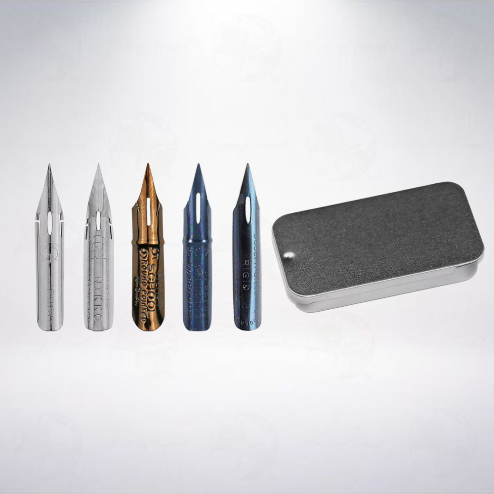 1. 套組內容包含「Zebra G 英文書法/漫畫專用筆尖」、「Nikko 超研磨 G 沾水筆專用筆尖」、「Hunt 56 沾水筆專用筆尖」、「Gillott 404 沾水筆專用筆尖」、「Gillott 1068A 沾水筆專用筆尖」、「沾水筆尖收納滑蓋小鐵盒」各1個。