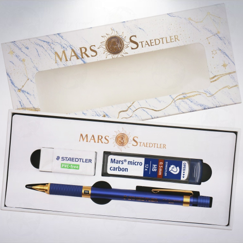 「施德樓/STAEDTLER」公司為旗下極受市場歡迎的「925」系列所推出的「中國限定」版本第6彈。筆身顏色為相當典雅的皇家藍,筆頭、筆夾與硬度指示窗則採用霧面金呈現,讓前後連成一氣,營造獨特的復古風格。筆芯尺寸只有0.5mm單一選擇,筆蓋上面標註「STAEDTLER limited edition」的字樣,以圓形方式圍繞著原廠標誌。附有筆身橡皮擦,並帶清潔針可供清潔筆頭內殘存的筆芯。 出芯方式為按壓式出芯,其餘所有尺寸皆予定番版本相符。附上的專屬禮盒也以藍色為主色調,搭配復古典雅的早期圖騰,質感升級。無論送禮或收藏,都是極佳的選擇喔!