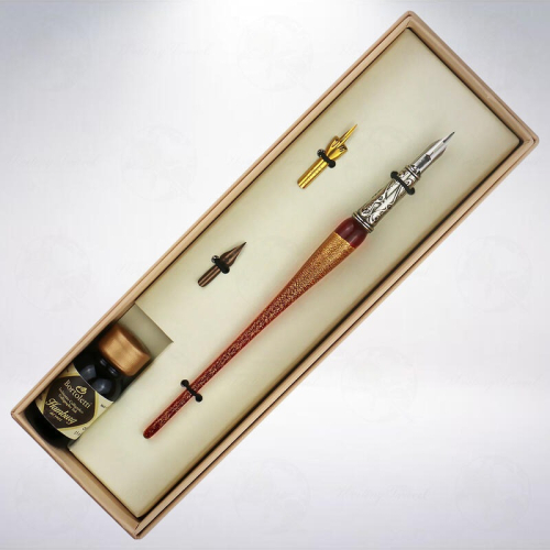 「Bortoletti」發跡於威尼斯河邊緣的一個小型實驗室。基於對書寫的熱情,提供與製作完全手工製的高品質各式書法用具。 本套組內含有沾水筆尖3支、墨水1瓶與玻璃筆1支(如第1張商品圖所示),玻璃筆共有5種不同的顏色包含黑色、藍色、紅色、琥珀、綠色可以選擇,筆身內包覆24K金箔。商品圖中的筆尖與墨水為示意,出貨時皆為隨機出貨,款式無提供選擇,請務必注意。