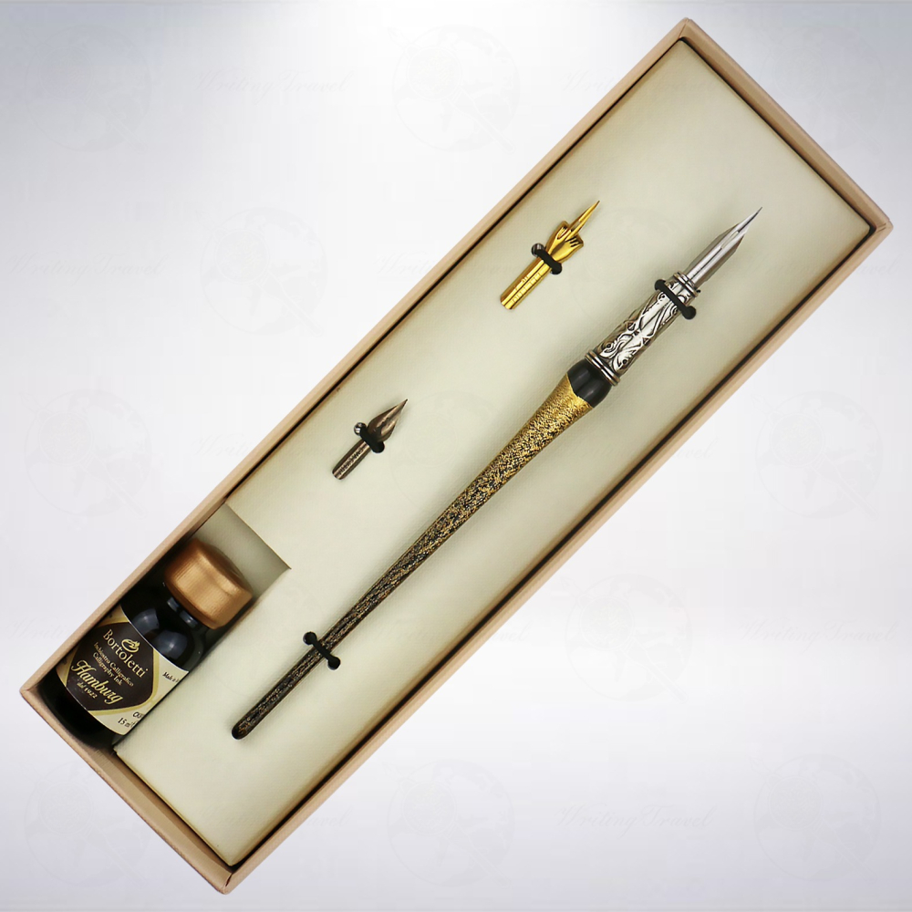 「Bortoletti」發跡於威尼斯河邊緣的一個小型實驗室。基於對書寫的熱情,提供與製作完全手工製的高品質各式書法用具。 本套組內含有沾水筆尖3支、墨水1瓶與玻璃筆1支(如第1張商品圖所示),玻璃筆共有5種不同的顏色包含黑色、藍色、紅色、琥珀、綠色可以選擇,筆身內包覆24K金箔。商品圖中的筆尖與墨水為示意,出貨時皆為隨機出貨,款式無提供選擇,請務必注意。