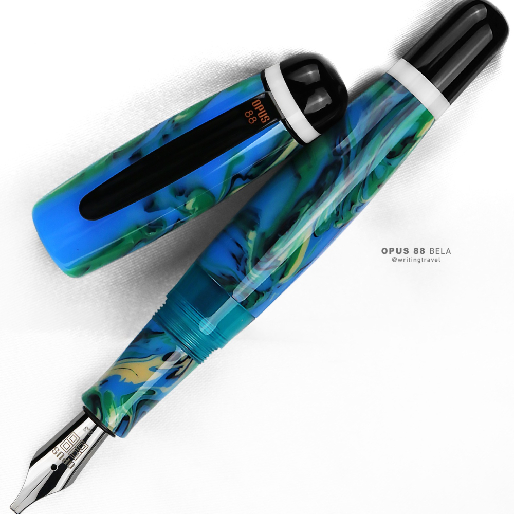 來自台灣的「製筆精基/OPUS 88」於2019年所推出的全新筆款: 「BELA 」,其在葡萄牙文裡意指「美麗、漂亮」之意,特別以壓克力樹脂打造幻彩筆身,共有2款顏色,一款為紅色,以紅色為基底,搭配橘色和黑色漩渦; 另一款為藍色,則是藍色為基底,搭配綠色和黑色漩渦,每支紋路皆不同,獨特有味道。上墨方式使用其擅長的「正統滴入式」上墨,儲墨量大,出墨順暢,且防漏機制完備,使用安心且愉悅。這次全新筆型搭載德國Bock不銹鋼筆尖,帶有軟彈感,書寫滑順,筆尖尺寸有EF、F、M、B、 2.3mm,可依照自己書寫習慣做挑選。