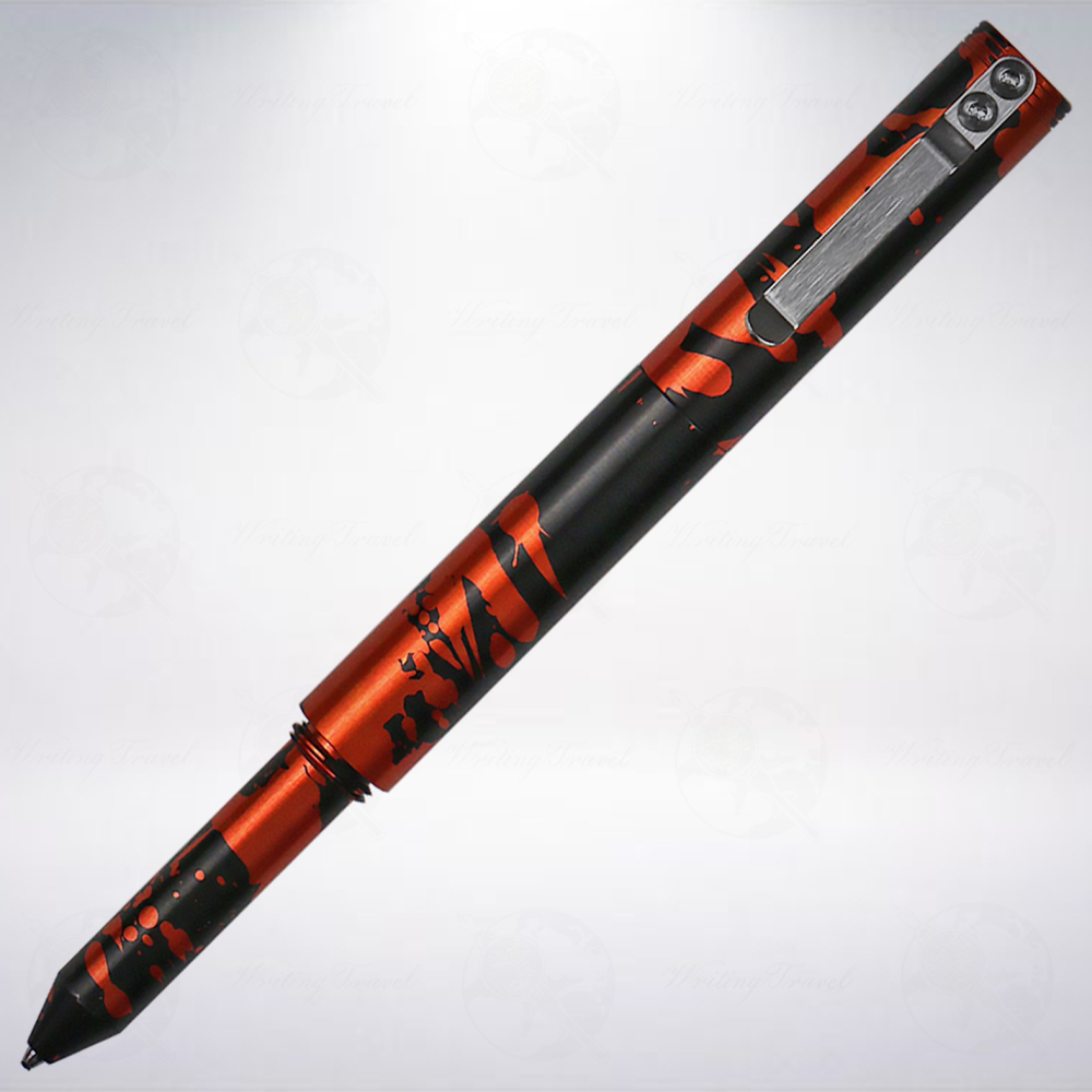 「經典機械原子筆/Classic Machined Pens」是一款設計扎實,金屬機械感爆表的產品,整支筆身皆以金屬鋁(Polished Aluminum)加工製成,並施以特殊的黑橘色陽極化處理,橘色噴濺紋路在黑色的筆身表面,使得整體更佳動感,也更加醒目。闔蓋長度約為10.2cm,重量約為32.5g,大小適中,重量合宜,搭配上堅固小巧的筆夾,十分適合當作日常隨身攜帶的好夥伴,無論用於簽名、筆記或畫草圖皆非常實用。另外,由於筆身沒有經過複雜的表面處理,外觀幾乎為「原」材質,因此也會隨著使用時間呈現不同的「樣貌」,是非常值得得玩味的工藝品。筆芯規格為「Fisher Pressurized Refill」,更換時需要以平口起子將背面旋開即可更換,非常具有操作樂趣喔!