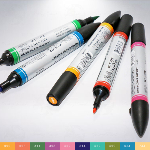 英國著名製造商「溫莎牛頓/Winsor&Newton」所生產的雙頭水性麥克筆,一端為子彈形筆頭,另一端為軟性的筆刷頭,適用於著色、藝術字書寫等,顏料具有耐光性和高度的色彩飽和度,是相當實用的工具。 具有多種顏色可供選擇,包括淺鎘橙/Cadmium Orange Hue、鎘紅/Cadmium Red Hue、胡克綠/Hooker's Green、鮮紫色/Mauve、耐久玫瑰紅/Permanent Rose、酞菁藍/Phthalo Blue、酞菁綠/Phthalo Green、樹綠/Sap Green、土耳其藍/Turquoise 、土黃色/Yellow Ochre共10種。