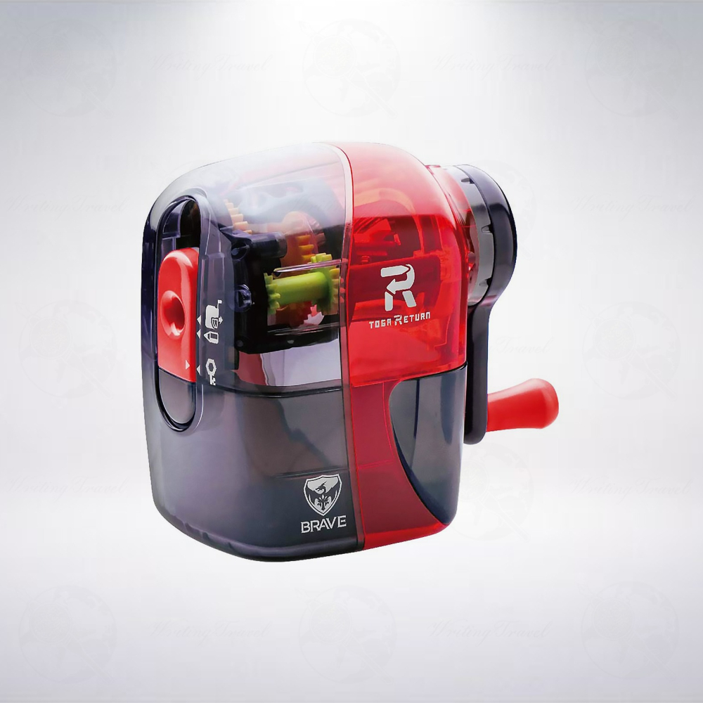 日本SONIC公司致力於創造適合辦公室使用的產品,並著重於其易用性,「TOGA RETURN」系列手動削鉛筆機是一款無論成人或兒童都可以輕鬆使用的實用工具,通透的機身可以在使用過程中,看到內部齒輪與機芯的運作,提供高度的機械樂趣,紅黑配色給人一種競速感,讓視覺上看起來更增添運動感。使用時,需使用背面的撥鈕分別選取「鎖定」、「削鉛筆」與「打開儲屑盒」共3種功能,第1種為收納時使用,第3種則為清理鉛筆屑時使用,只有在此模式下可以將儲屑盒抽出,不用擔心在收納或使用時,其有滑落的風險,選取「削鉛筆」功能時,兼容六角形、三角形和圓形等類型的鉛筆,將其插入機身內部,手感上會有一個卡住的回饋感時鉛筆及固定,這時與使用一般削鉛筆機相同,轉動另一側的旋桿即可開始作業,齒輪的設定讓使用時更為省力,機身的底部做防滑材質處理,避免使用時不必要的滑動,鉛筆削完後會往外退出,這時直接將鉛筆抽出即可,筆尖不會被過度削尖,以致於重心過高容易在使用過程中斷裂。