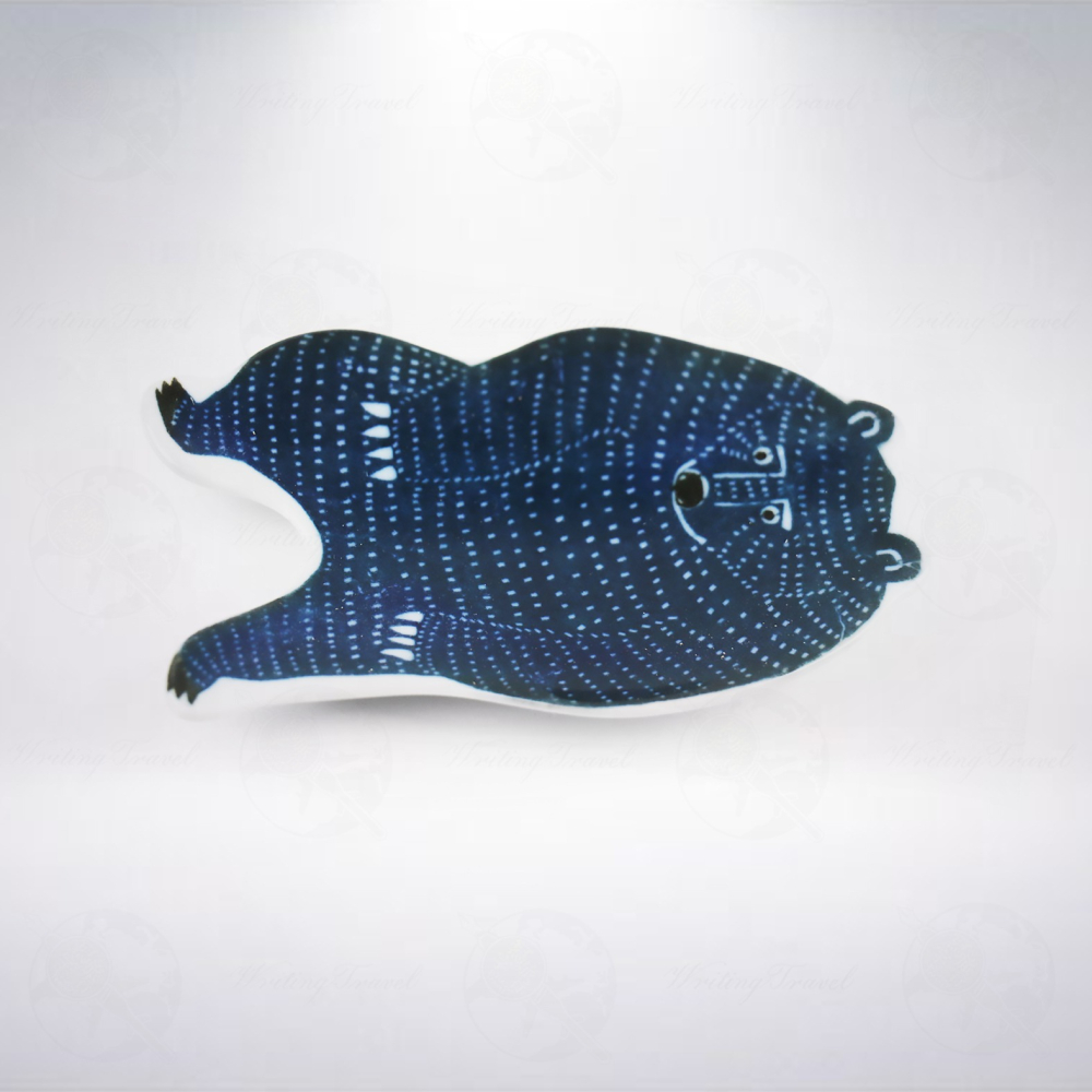 「倉敷意匠」為致力發揚日本傳統手工藝的生活雜貨品牌,擅長與不同的手工藝職人或工房合作開發企劃各式生活道具及用品。瓷器本體使用傳統工法「型紙摺り」與「銅版転写」製作而成,特殊的熊造型施以傳統色「紺藍色」呈現,帶有濃濃的和式風格,使用手工製作,每件作品間在顏色或紋路皆會有所不同,每個都是獨一無二的樣子。平常放在書桌上的時候,可以用來收納些許小型物品,例如迴紋針、貼紙、筆尖等。
