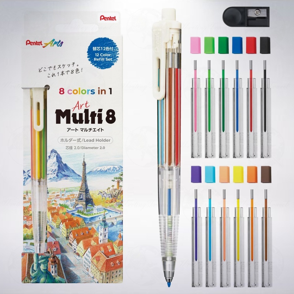 日本文具大廠「Pentel」公司所推出的創新商品:「Multi 8」,內附紅色、藍色、棕色、橘色、黃色、黃綠色、天藍色和粉紅色,可以旋轉筆夾接近筆蓋處凸起的位置到筆身上顏色的位置,再按壓筆蓋,即可使用該顏色,要將筆芯收入時,請將筆蓋向下壓到桌面到筆芯完整收入筆身即可。非常適合拿來勾勒草圖、筆記或者塗鴉使用,便利性極高。