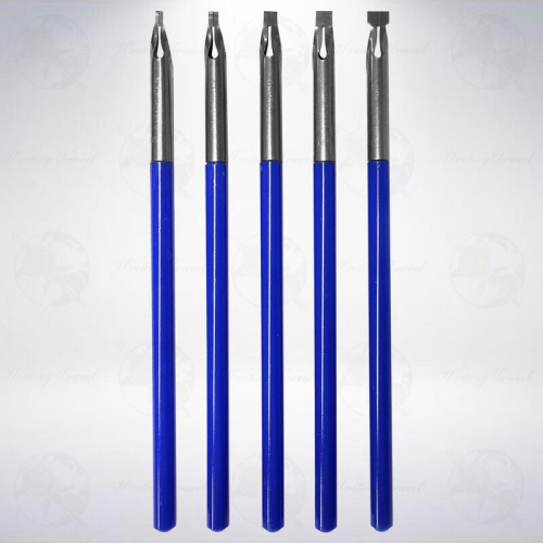 由專門製作英文書法筆尖的英國Mitchell公司生產,由一片金屬片凹成方型的寬筆尖內建儲墨器加上藍色塑膠筆桿所構成。使用時,只需輕壓就可以出墨,建議將整個墨孔和除墨器都沾滿墨水,可以有效提升書寫續航力,第一筆通常墨量較大,建議將第一筆劃先寫在另外一張紙再正式進行創作;寫感相當滑順,某個角度勾勒細線也可以,適合練習英文花體字、玩墨試色和畫畫創作。