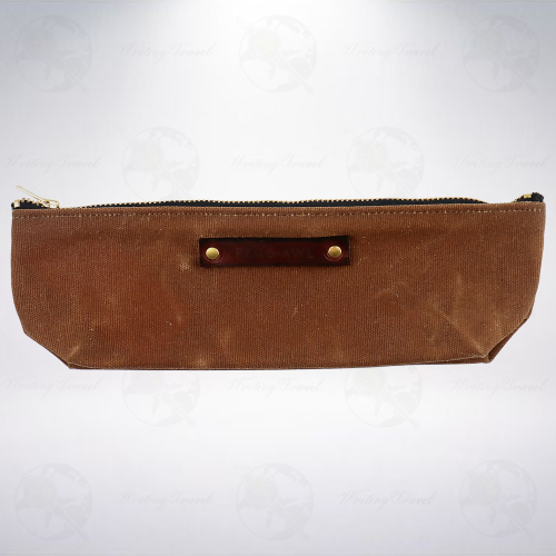「The Drafter Pouc」橫式筆袋,材質為上蠟帆布,防水防髒污且易清潔,為長方形橫式造型,正面用黃銅鉚釘釘上由植物鞣皮革製成的品牌標籤,簡單俐落; 整體形狀呈現長方形,內部空間精簡,可放各式隨身的筆記具(鉛筆、自動鉛筆、沾水筆或水彩筆等),收納性良好,且易攜帶,放入隨身包包也很方便,是外出旅行的好伴侶。本款式「香料/Spice」為黃棕色的帆布搭配棕色名牌,色調相近,復古感濃烈,呈現獨特的風格。