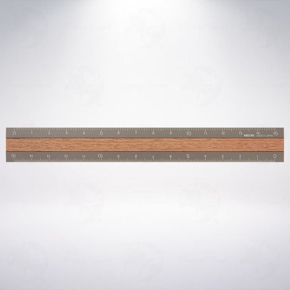 時尚的15cm直尺,材質使用鋁和沙比力木拼接而成,不僅輕巧堅固,並兼具時尚的氣息。尺的兩側皆有刻度,一邊以0.5mm為單位,另一側以1.0mm為單位,採用雷射雕刻方式形成,長久使用也不易消失。從側面看時,它呈類似「山」形,不僅易於握持,使用時,也容易在作業表面上壓實。