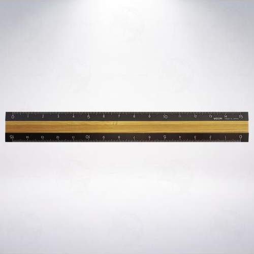 時尚的15cm直尺,材質使用鋁和竹子拼接而成,不僅輕巧堅固,並兼具時尚的氣息。尺的兩側皆有刻度,一邊以0.5mm為單位,另一側以1.0mm為單位,採用雷射雕刻方式形成,長久使用也不易消失。從側面看時,它呈類似「山」形,不僅易於握持,使用時,也容易在作業表面上壓實。