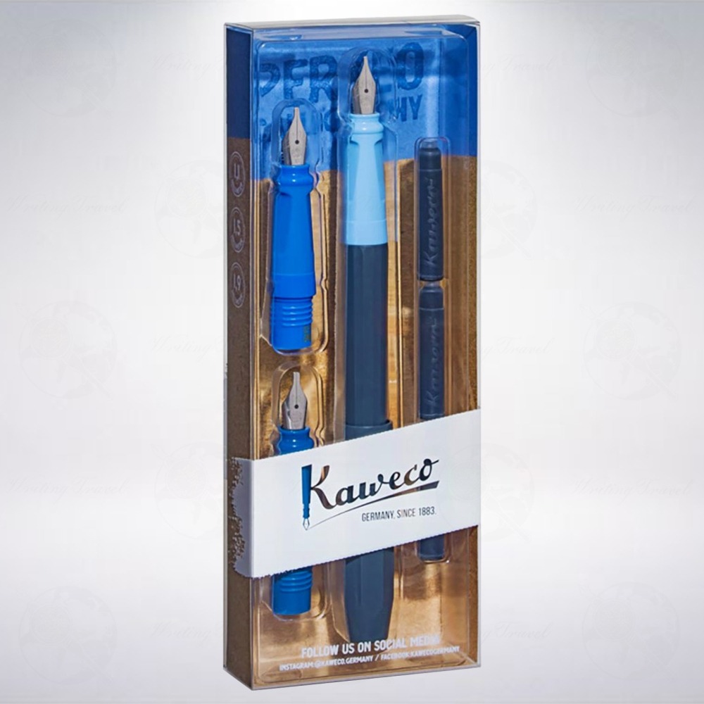 「PERKEO Calligraphy Set 藝術書法鋼筆組」包含一支深藍色筆身的Perkeo鋼筆,並附有3個不同尺寸的筆尖,以握位顏色深淺區分尺寸: 1.1mm為淺藍色;1.5mm是寶藍色,1.9mm是深藍色。高品質的做工、熟悉的八角形筆蓋與筆身、經典的不銹鋼筆尖,舒適的三角形手柄,無論任何使用者,皆可輕易上手。