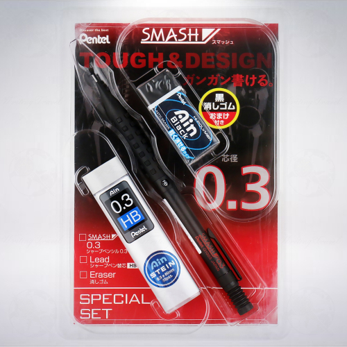 注意事項: 套組內容為「Pentel SMASH 0.3mm 自動鉛筆」、「Pentel Ain 0.3mm/HB筆芯」、「Pentel Ain 黑色橡皮擦」各1