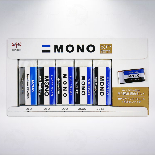日本「蜻蜓/Tombow」公司為了紀念MONO發行50週年,全新推出的紀念橡皮擦組,內含5個橡皮擦,分別以1969、1980、1990、2000、2013年的風貌呈現,讓人一窺其在各個時代所展現的風情。另外,特別附上一個MONO造型的徽章,僅包含在此橡皮擦組內一同發售,是文具迷們必定要收藏的聖品。