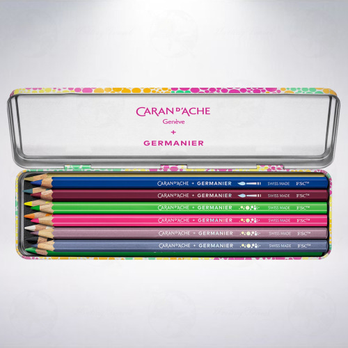 由知名國際大廠「卡達(Caran d'Ache)」所原創的經典筆款「849」系列,自1969年開始生產以來,全球累積銷量已經超過1500萬支,深受許多使用者的青睞。「GERMANIER」是「卡達(Caran d'Ache)」與瑞士時尚設計師Kévin Germanier合作推出的「Les Fulgureuses」特別版。旨在大膽頌揚色彩與創意,完美捕捉了無畏的能量。內含13支色鉛筆裡包含5支標示為「standard colors」(91 Cream、089 Dark Carmine、220 Grass Green、040 Ultramarine Blue、009 Black),4支「metallic colors」:(499 Gold、081 Pink、120 Violet、710 Phthalocyanine Green」,4支「fluorescent colors」(240 Lemon Yellow、030 Orange、090 Purple、230 Yellow Green)