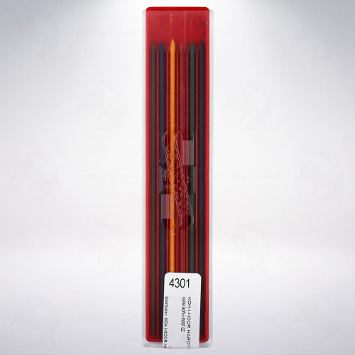捷克「KOH-I-NOOR」公司所出品的2.0mm彩色筆芯,可以適用於市面上大部分的2.0mm工程鉛筆,不建議使用在按壓式出芯的筆款,因為本身蠟質成分帶有些許粘稠性,可能會卡機芯中。每盒內含6支筆芯,包含黑色、藍色、紅色、綠色、黃色、棕色各1支,長度為12公分。
