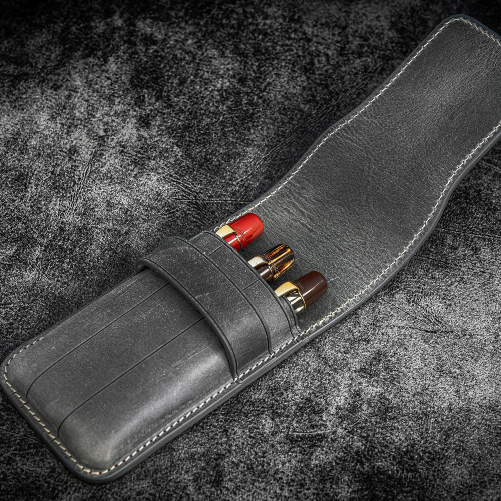 「Galen Leather Co.」是一家家族企業,總部位於土耳其伊斯坦布爾。標榜100%手工製作,精心設計的手工皮具系列在過去幾年風靡文具界。每個產品都來自於實用的設計和有意義的構造,從而生產既實用又美觀的東西。材質上使用100%植鞣牛皮(瘋馬皮也稱瘋牛皮),全粒面皮革,使用打蠟聚酰胺線手工縫製,邊緣經過斜切、打蠟和拋光處理,打造完美外觀,內含3個筆槽,適合長度最長約14公分和軸徑約1.5公分的筆記具,經測試可收納的筆款,包括老Pelikan 400NN、Pelikan Souveran M800、Pelikan M150、Lamy Safari、Lamy AL-Star、TWSBI 580 AL、TWSBI VAC 700、Parker Sonnet、白金 #3776等。