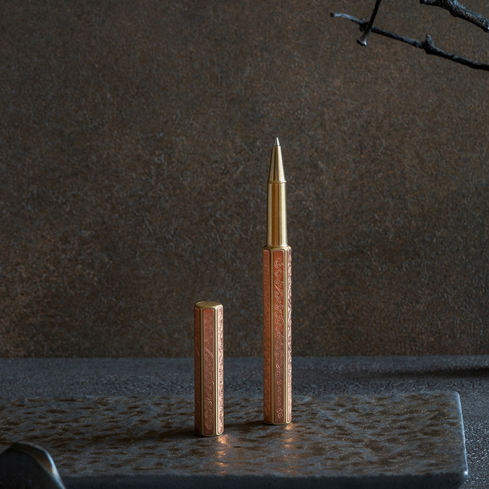 「伊藤鋼雕刻所」約於1920年創業。是愛知縣名古屋市內一間日本僅存以手工製造和雕用雕金鏨的製造工廠。第3代的代表為伊藤充浩先生。1943年出生,1965年進入家族企業的伊藤鋼雕刻所工作,並師從父親伊藤金治郎。從那時起就一直在幕後支持著日本傳統的佛壇、佛具和神社寺院等地所使用的金屬配件的製造。主理人竹內直希先生1982年出生於京都。負責家族事業「竹內錺金具」的生產製作,主要從事佛壇裝飾金屬配件、神社寺廟五金的生產與修復。2020年推出自有品牌「錺之KAZARINO」,同年擔任竹內株式會社代表董事,以錯金具的重要精神:「裝飾的力量」為品牌出發點,希望幫助人們透過裝飾生活而更加快樂,並持續挑戰在框架之外的各個領域中發展鍩金具的應用變化。「竹內株式會社」成立於1967年,原先是一家生產吊燈的公司,目前主要生產和修理佛壇裝飾品的金屬配件。在進行傳統工藝的同時,也引進了機械設備,迄今已生產了3,000多種金屬裝飾件。講究只有手工雕刻能表現出的柔軟質感,並能夠生產出質量穩定的產品。此外實現一種超越宗教設備框架並融入日常生活的錨金屬配件。「錺」為金屬工藝的一種,在飛鳥時代(西元592年到710年)隨佛教傳入日本,並由此發展出雕金和鍛金等金屬加工技術,常用作佛教祭祀物的金屬裝飾;隨著時代演進,錺金具逐漸擴展至生活成為高雅的裝飾點綴,爲日常述說意義非凡的百年工藝故事。筆款選用物外經典鋼珠筆,堅固紮實具有一定的重量,書寫時可以維持絕佳的滑順度和穩定,無論是筆記或是簽名,都是種享受。