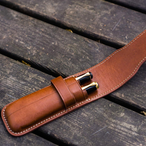 「Galen Leather Co.」是一家家族企業,總部位於土耳其伊斯坦布爾。標榜100%手工製作,精心設計的手工皮具系列在過去幾年風靡文具界。每個產品都來自於實用的設計和有意義的構造,從而生產既實用又美觀的東西。材質上使用100%植鞣牛皮(瘋馬皮也稱瘋牛皮),全粒面皮革,使用打蠟聚酰胺線手工縫製,邊緣經過斜切、打蠟和拋光處理,打造完美外觀,內含2個筆槽,適合長度最長約14公分和軸徑約1.5公分的筆記具,經測試可收納的筆款,包括老Pelikan 400NN、Pelikan Souveran M800、Pelikan M150、Lamy Safari、Lamy AL-Star、TWSBI 580 AL、TWSBI VAC 700、Parker Sonnet、白金 #3776等。