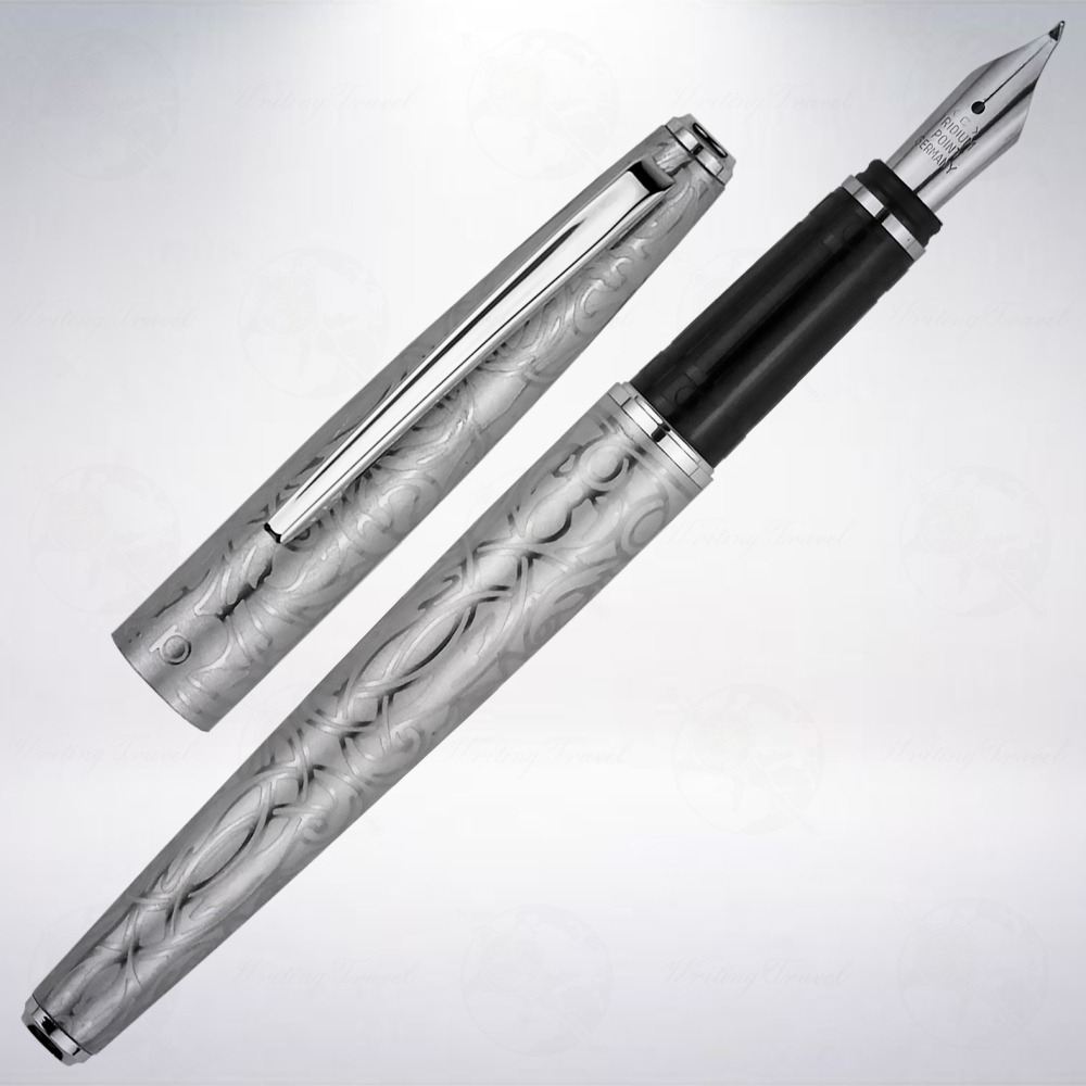 「白金/Platinum」所出品的特殊書法尖鋼筆,筆尖呈現彎曲,可以依據書寫時運筆的角度不同而寫出各種粗細不一的線條。 不銹鋼筆身,重量適中。其上飾以唐草紋圖騰,質感佳。