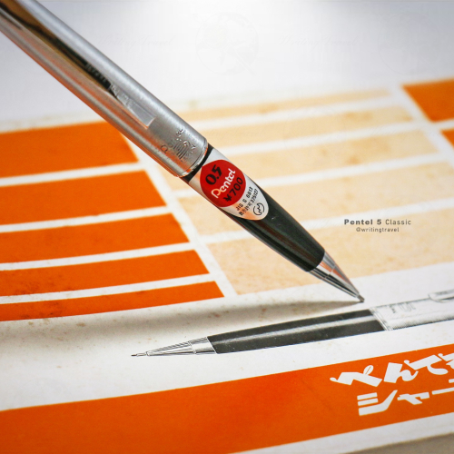 日本Pentel公司所發行的經典自動筆款: 「万年CIL (KERRY, ケリー) 」的前身「Pentel 5」系列,在其身上已經可以看到爾後出現在「万年CIL」上的明顯特徵,在筆身配置的比例上也十分相似,筆身、筆夾與筆頭皆採用金屬製成,外觀上十分扎實,略帶有金屬本身的紋路,增添不少視覺感,握位採用塑料製成,提供部分的止滑力,雖不非常明顯,但也有效區分握位與筆身區域。筆身中心標註有夢幻的「Pentel 5」字樣,而且以鑿刻方式呈現,目前現行筆款已不復見。筆帽下附有筆身橡皮擦,下方有通芯針,可以在筆芯卡在筆身內使用。筆身長度只有11.6cm,重量約只有12g,整體來說屬於小巧的筆款。這支經典的自動筆,已停產多時,想要收藏的朋友們,千萬不要錯過喔!