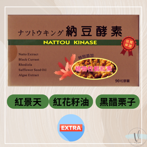 納豆萃取(含納豆激脢)、黑醋栗子、明膠、紅景天、紅花籽油、大豆油、藻類萃取(含蝦紅素)、棕櫚種子萃取、蜂蠟、玉米萃取物、脂肪酸甘油脂、甘油、二氧化鈦、食用紅色6號、食用黃色4號、食用藍色1號。