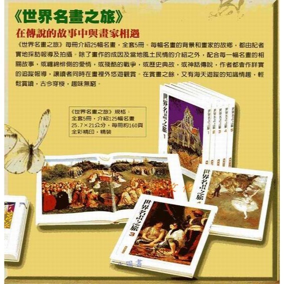 「世界名畫之旅」每冊介紹25 幅名畫,全套 5 冊。每幅名畫的背景或是畫家的故鄉,都由記者實地採訪報導以及拍攝。除了畫作的成因及當地風土人情民俗的介紹之外,配合每一幅名畫的相關故事,或纏綿悱惻的愛情,或殘酷的戰爭,或歷史典故,或神話傳說,作者都會翔實的追蹤報導,「世界名畫之旅」讓讀者同時在畫裡畫外悠遊觀賞。在賞畫之餘,又有每天遊蹤的知識情趣,輕鬆賞讀,古今穿梭,趣味無窮。