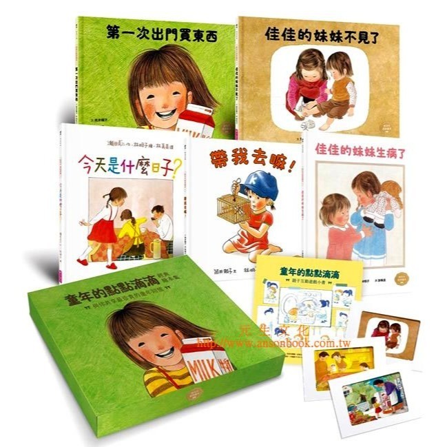 1「童年的點點滴滴」經典繪本集,是由孩子演給孩子看的紙上「劇場」,呈現令人怦然心動的日常──跟著《第一次出門買東西》戰戰兢兢的迎向第一次的挑戰;為家人設想的小心思貫穿《今天是什麼日子?》全書,一氣呵成;《佳佳的妹妹不見了》、《佳佳的妹妹生病了》裡的危機起伏,為無憂無慮的生活帶來小衝擊;妹妹的小願望引爆《帶我去嘛!》裡的兄妹諜對諜大戰,幽默的互動展現衝突又親愛的手足情。