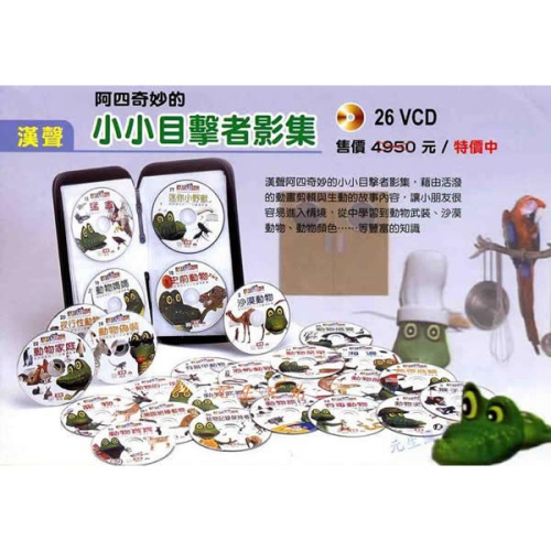 【小小目擊者 VCD】是一套專為孩子製作的大自然影片,由逗趣的串場人物阿四陪伴孩子親眼目擊動物世界的奇妙!在四腳蛇──阿四的帶領下,孩子們可以在歡樂中欣賞難得一見的動物精彩鏡頭。