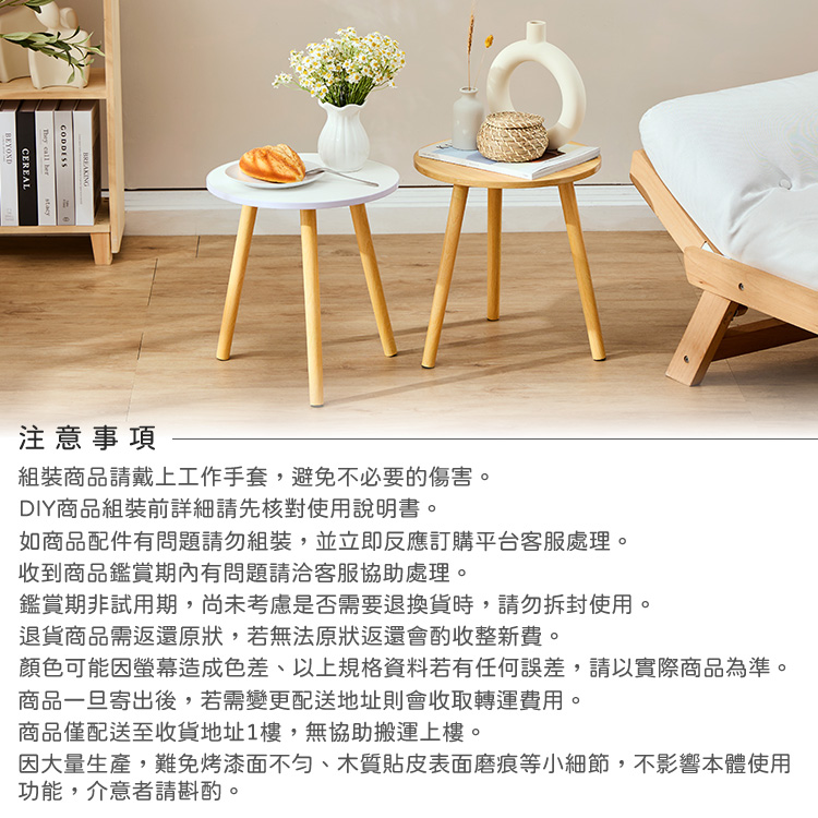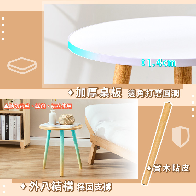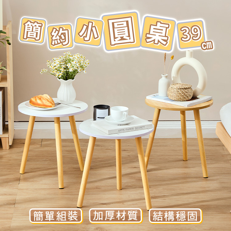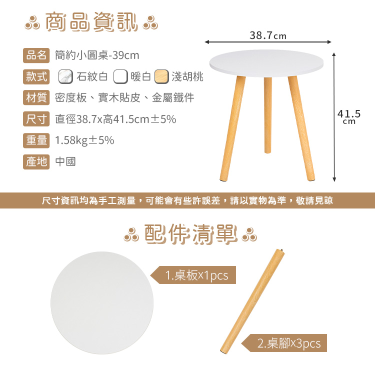 款式:簡約小圓桌-40cm 尺寸:長40寬40高41.5cm(±5%) 重量:約1.58kg(±5%) 材質:密度板、實木貼皮、金屬鐵件 產地:中國