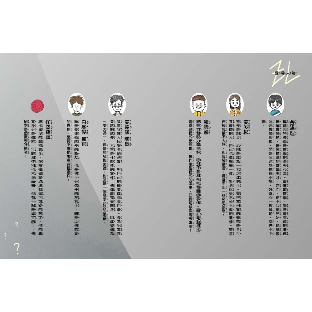 為了充分享受《數學破案神探》系列,最好仔細閱讀。讀這本書時,你就和述理、多彬、舫國一樣,是數學破案神探隊的一員,觀察怪盜羅蘋留下的痕跡,推理出下一個犯罪時間或場所,你也會得到強烈的刺激感和成就感。如果想要提前翻到後面偷看提示或答案,請忍耐一下,因為憑自己的能力解決問題的話,喜悅將會更大!現在,請開始愉快的推理旅行,就由我來作嚮導吧!