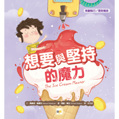 一個小小的心願,讓小男孩設定了目標,從計劃買冰淇淋機、努力賺錢、遇到挫折、再繼續努力賺錢。從規劃到執行,過程中讓他了解到金錢價值和勞力的付出,有時候是不對等的,甚至往往會衍生出更多的問題,要耗費更多的心力去解決。但他努力地朝自己設定的目標前進,憑藉著自己的堅持和努力,遇到問題就想辦法解決,一點一滴的完成了自己的大夢想。藉由如此生活化的故事,逐步讓孩子理解複雜的財商概念與堅持努力的重要性!