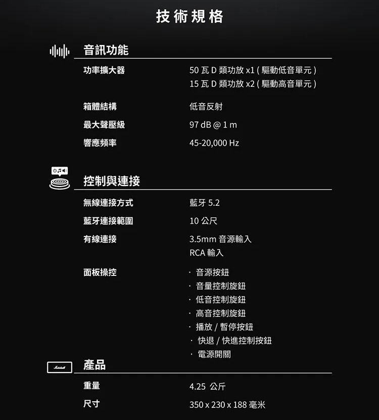 功率擴大器:一個 50 瓦 D 類功放 用以驅動低音單元。兩個 15 瓦 D 類功放 用以驅動高音單元。