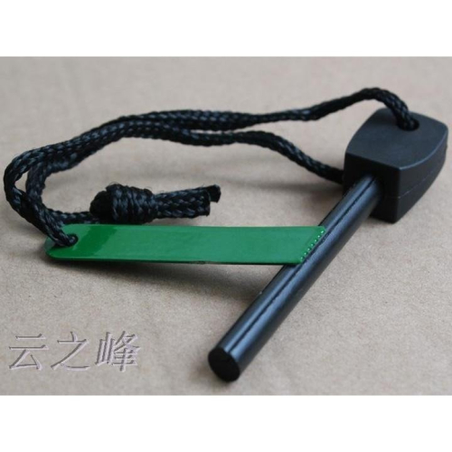 說到取火,大家第一感覺反應一定覺得“帶一個打火機不就够了”。但是不要忘了,户外活動、特别是在惡劣天氣條件下,風、雨足以讓打火機、火柴失效。此时,最可靠的取火工具就是最原始的“燧石”,也就是要向大家介紹的户外求生打火石。 與天然燧石的成分主要為二氧化硅不同的是,現在使用的户外求生打火石是人工配製的合金、稀土金屬的衍生物,它也因此有了更好的性能——在與刀、鉅快速摩擦時能够掉落大量數千度的金屬屑,進而迅速引燃乾草、枯葉、木屑等天然引火物。 大家在談到户外求生打火石時,往往容易與鎂塊、鎂棒相混淆,這也許是受美軍裝備的鎂塊影響。實際上,美式引火鎂塊的主要成分是鎂,鎂只能起到助燃的作用,在美式鎂塊的一側同樣少不了打火石,使用時需要先切下一些鎂屑,再用打火石引燃。而户外打火石中,鎂只占少量比例,不僅能够與美式鎂塊一樣先擦下金屬屑再引燃,更透過迅速的刮擦,直接引燃引火物。 在著名的野外生存紀錄片。Discovery-man vs wild荒野求生密技中,男主角、英國特種部隊軍人貝爾.格里斯在極端的情况下只隨身携帶三件裝備——刀、打火石和軍用水壺