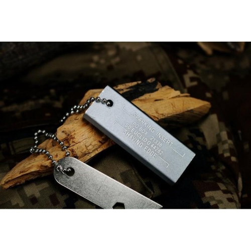 將鎂塊的一邊頂住地面呈45度角左右,離剛才所刮下的鎂屑約2.5公分,用刀刃快速地刮擦刻有Sparking insert的窄邊。為能有效的刮擦出火星,刀刃要與刮擦面呈垂直方向。如此便能引起火星,而將鎂屑燃燒,提供給你一個白色的火焰。