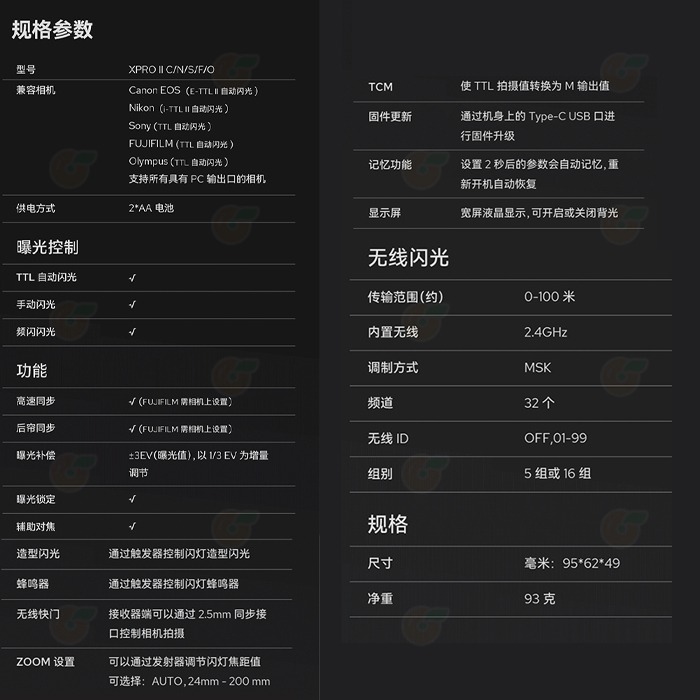 全面支援TTL自動閃光、HSS高速同步(最大閃光同步速度達1/8000s)、頻閃等功能。 LCD超大高解析度螢幕,配備5個組別按鈕及4個功能按鈕,參數設定清晰直覺。