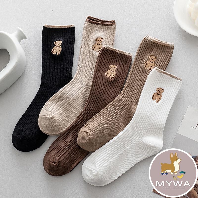 MyWa™️女生襪子系列 秋冬可愛小熊刺繡長襪 保暖中筒襪 韓系時尚ins潮流 W56