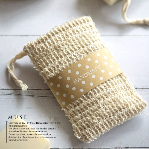 2.裝入手工皂並將束口繫繩收緊,沾水搓揉起泡,或直接套在手掌上抹取肥皂,於皮膚上輕柔打圈按摩,再以清水洗淨。
