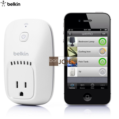 美國進口 Belkin WeMo Home Automation Switch 智慧型電源插座(全新盒裝) 支援 iPhone / iPad / iPod / Android 4.0以上 美國大廠貝爾金 Belkin 所推出最新的智慧型電源插座,讓您輕鬆地透過 手持裝置 開啟或關閉 WeMo 插孔上連接的電器,節省不必要電力的消耗。