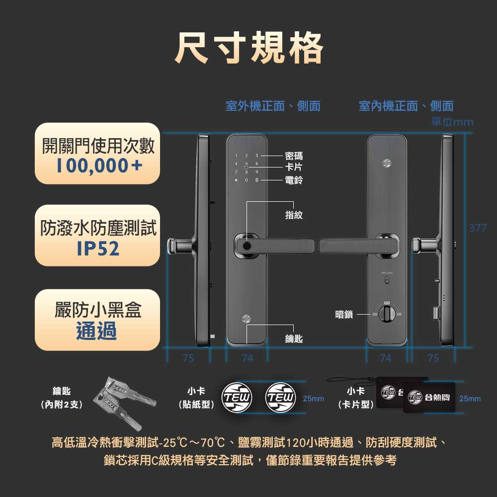 ◆高溫低溫冷熱測試-25~70度、鹽霧試驗120小時通過、抗靜電80,000、抗電壓(防小黑盒)、開關門使用次數100,000+,採用C及鎖芯等多項測試。