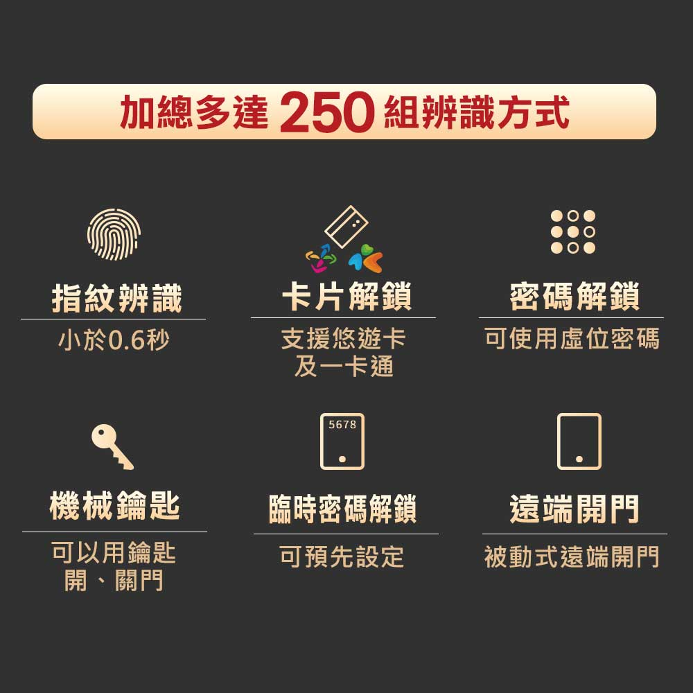 ◆指紋(最多可登記100組)+密碼+卡片,共可設定250組(內含10組管理員)。