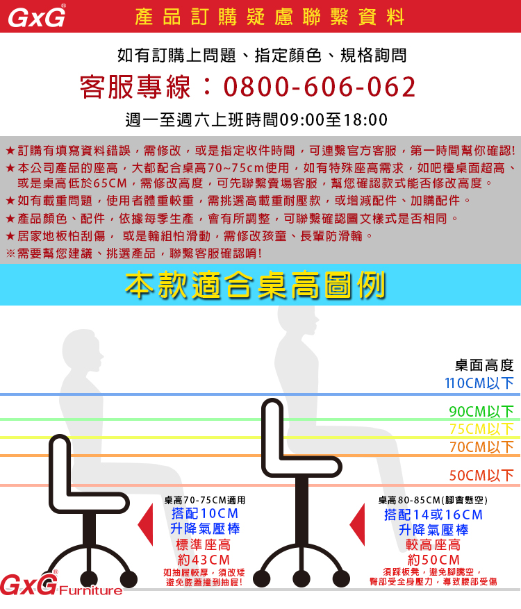 8.座面高度決定於氣壓棒使用長短,請選擇適當高度,若需求較高高度,建議加長氣壓棒尺寸,避免高度不夠,將氣壓棒升到最高,容易造成氣壓棒損壞。