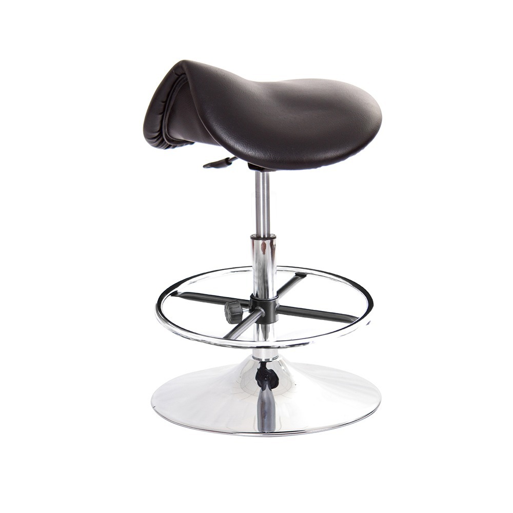 一般傳統工作椅,都屬於平面圓型的座墊,如過度側偏容易翻倒,而馬鞍型的特色就是,能乘座在座椅工作時,雙腳微夾使重心更穩,不易過度側偏摔倒的情形。