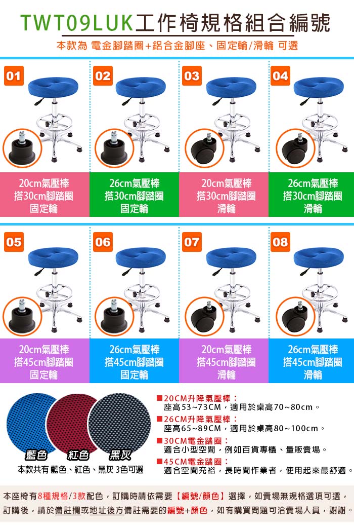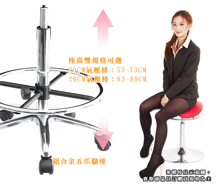 8.座面高度決定於氣壓棒使用長短,請選擇適當高度,若需求較高高度,建議加長氣壓棒尺寸,避免高度不夠,將氣壓棒升到最高,容易造成氣壓棒損壞。