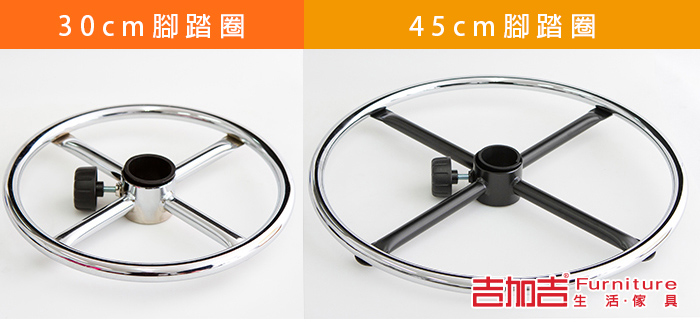 精緻金屬踏圈,有直徑30、45cm可選,在您使用吧台、櫃台時,高座位可腳踩踏不懸空。