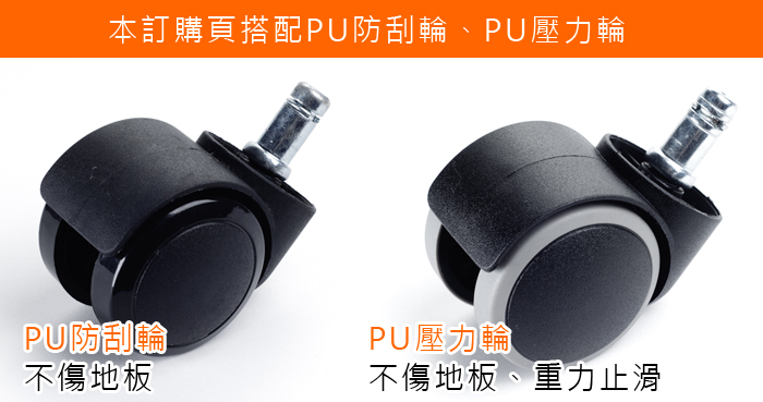 本款使用『PU壓力輪』:椅子承重時,輪面會因重量下壓固定不滑動;椅面沒有重量時,保有『一般滑輪』作用方便滑動,不傷地板。