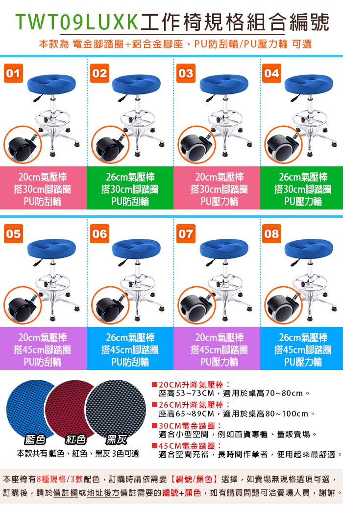 8.座面高度決定於氣壓棒使用長短,請選擇適當高度,若需求較高高度,建議加長氣壓棒尺寸,避免高度不夠,將氣壓棒升到最高,容易造成氣壓棒損壞。