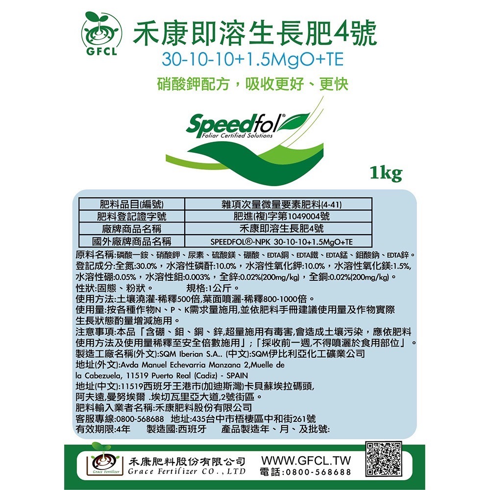 *登記含量:全氮30.0%、水溶性磷酐10.0%、水溶性氧化鉀10.0%、水溶性氧化鎂1.5%、水溶性硼0.05%、水溶性鉬0.003%、全鋅0.02%、全銅0.02%