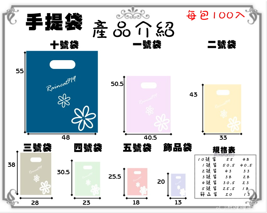 十號打洞袋款式:(48*55cm,每包100入) 粉心、藍心、黑金花、扶桑花、年年有魚、娃娃車、法國風、向日葵、粉喵喵、銅扶花、藍藤花、紫藤花、咖圈、白象兔、素面藍、素面粉、素面黃。